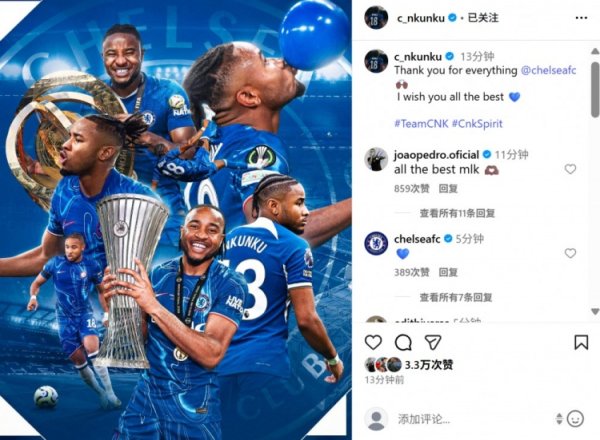 恩昆库社媒告别切尔西:感谢球队所做的一切,送上最美好的祝愿8月30日讯 27岁前场球员恩昆库正式加盟AC米兰,球员也在个人社媒晒出在蓝军时期的一些高光时刻告别球队。 恩昆库社媒写道:“感谢切尔西俱乐部所做的一切,为你献上最美好的祝愿!”