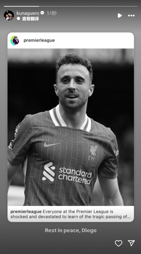 阿圭罗社媒转发若塔照片:安息吧,迪奥戈
