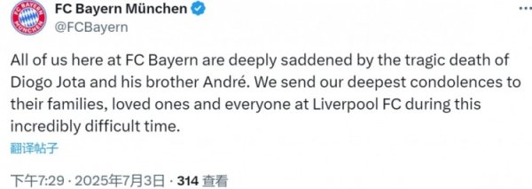 拜仁社媒:对若塔兄弟的离世深感悲痛,向家人、利物浦致以慰问